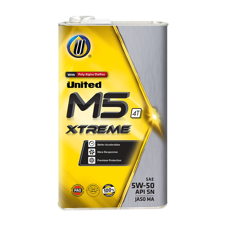 United M5 Xtreme là loại dầu nhờn tổng hợp toàn phần thế hệ mới mang đến sự phát triện mới nhất trong công nghệ dầu bôi trơn nhằm tối đa hóa khả năng bảo vệ cho thế hệ động cơ mới nhất. Được cũng cố bằng gói phụ gia mạnh mẽ kết hợp thanh phần dầu gốc Polyalphaolefins (PAO), dầu này đáp ứng mức hiệu năng API SN cao nhất và vượt hơn hầu hết các yêu cầu khắt khe liên quan kiểm soát khí thải động cơ hiện đại cũng như mức tiêu hao nhiên liệu. Trong kỷ nguyên ý thức về năng lượng ngày nay, dầu xe máy 4 thì United M5 Xtreme cũng được tạo ra nhằm cải thiện hiệu năng nhiên liệu bằng việc tiết kiệm chi phí nhiên liệu cho người sử dụng.